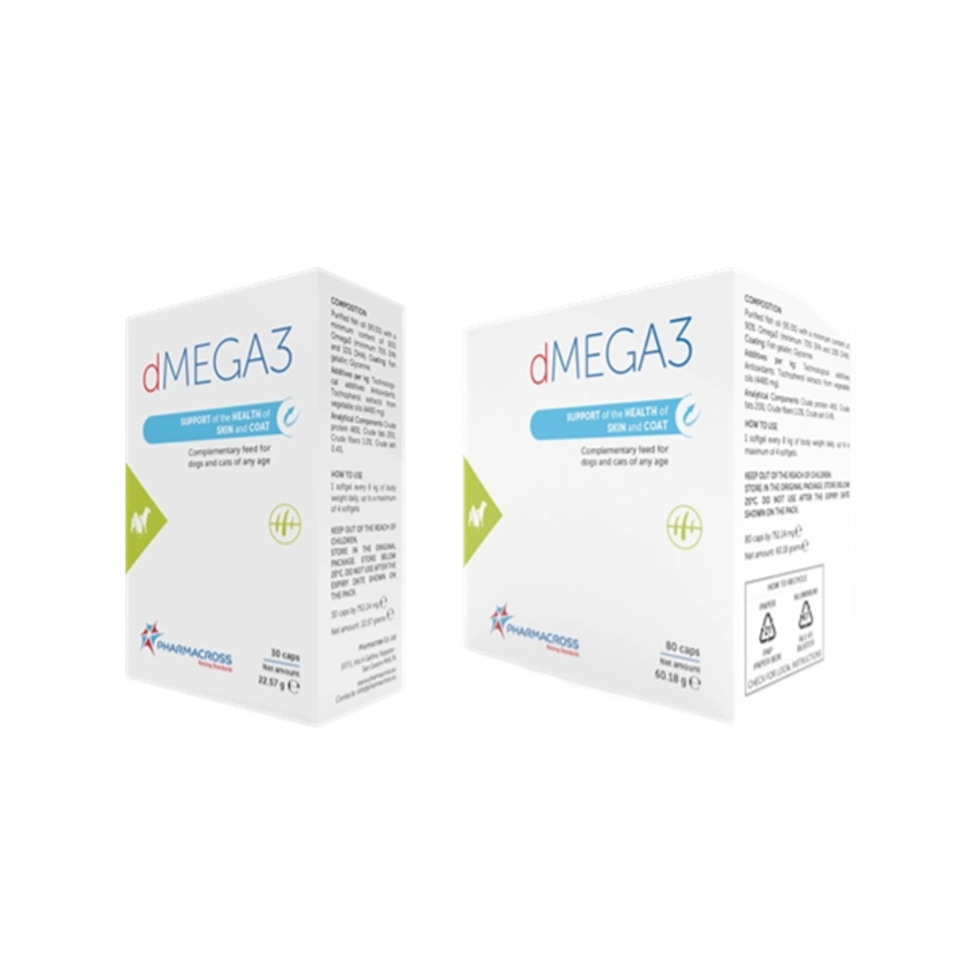 - dMEGA3 – koncentruotas Omega3 papildas šunims ir katėms – sveikai odai ir kailiui palaikyti