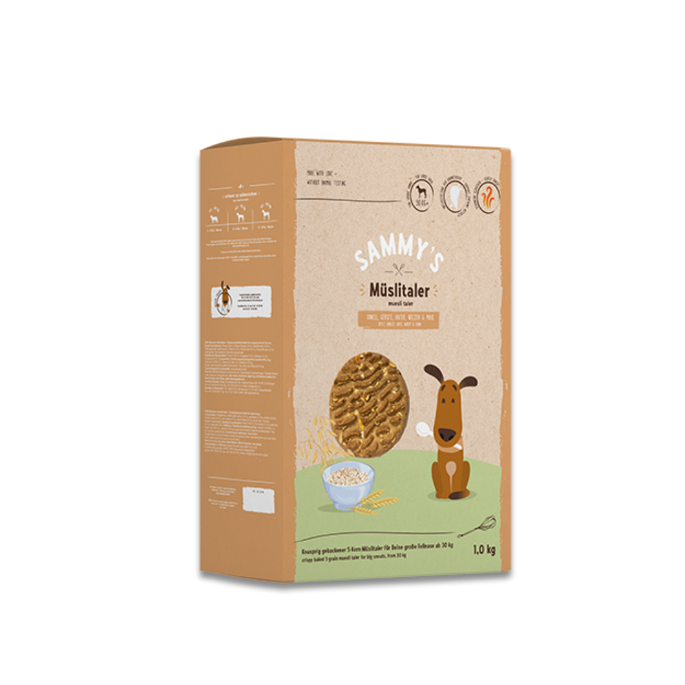 - traškūs nesmulkinti grūdai, sotūs kukurūzai, stiprūs kvietiniai ir speltos miltai bei švelnūs avižų dribsniai yra Sammy Müslitaler ingredientai. Aukštos kokybės 5 grūdų mišinys kruopščiai minkomas pagal senas kepimo tradicijas ir švelniai kepamas orkaitėje.Aukso pluta išsiskiriantis mūsų 5 grūdelių Müslitaler yra ypač kietas ir traškus, todėl jūsų didelė pūkuota nosis gali ilgai jį kramtyti.